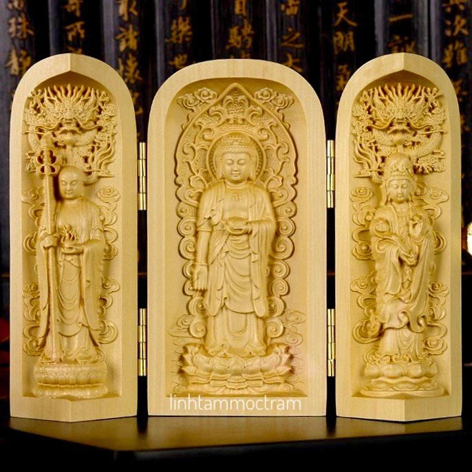 Ba vị Phật – Bồ Tát đại diện cho Từ bi – Trí tuệ – Cứu độ, giúp người hữu duyên giữ tâm thanh tịnh, hóa giải phiền não, mang đến bình an trong cuộc sống và công việc.