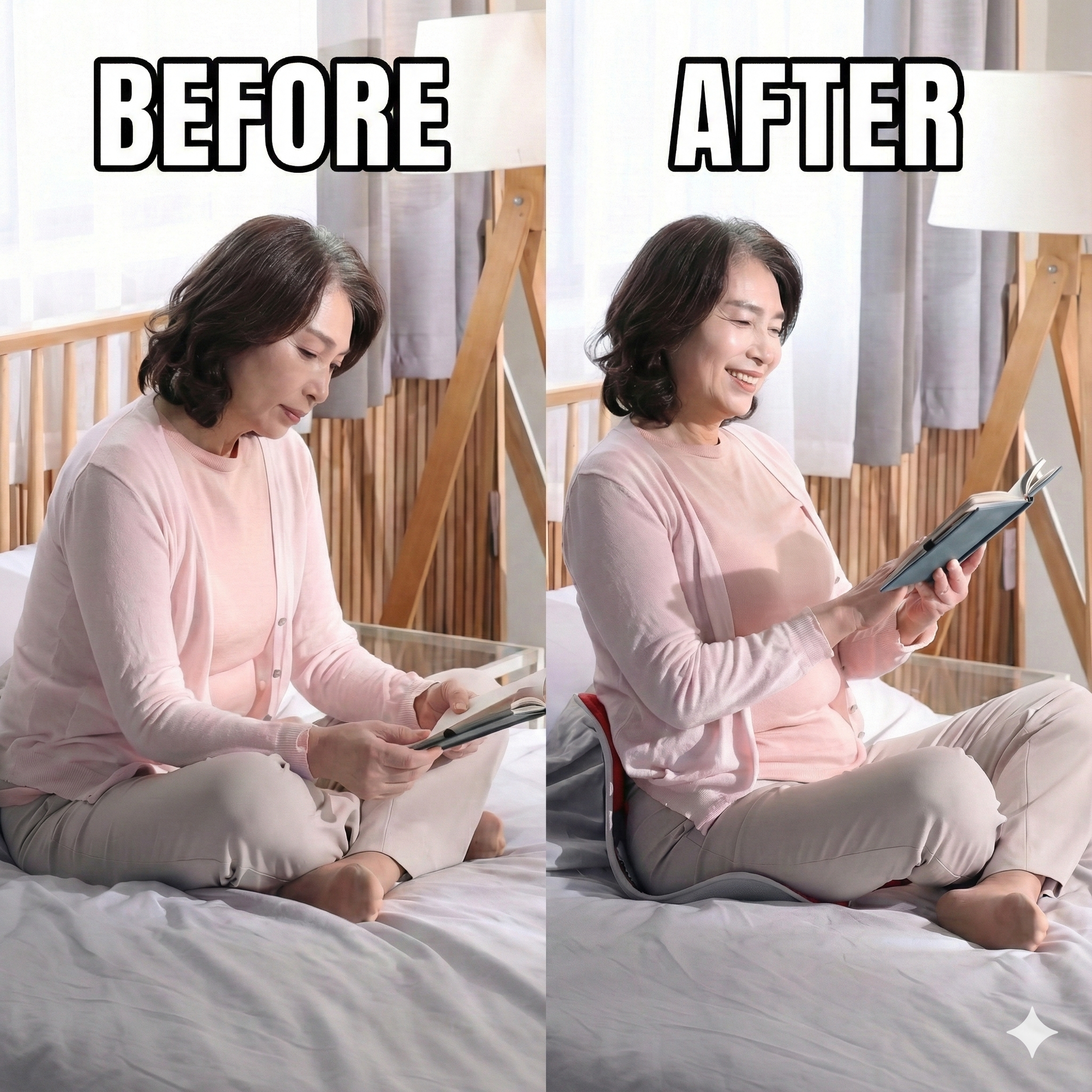 Ghế thiết kế riêng cho nữ giới, với mặt ngồi hai bên cong lên, nâng đỡ xương cụt, phù hợp với cấu trúc xương chậu và góc mở xương đùi của nữ giới khoảng 120°. Thiết kế hỗ trợ lưng dưới, giữ cột sống đúng dáng tự nhiên, giúp giảm đau mỏi lưng, vai và cổ khi ngồi lâu. Đặc biệt hữu ích cho các mẹ sau sinh thường xuyên phải bế bé. Sử dụng mọi lúc, mọi nơi: sàn nhà, ghế làm việc, sofa, giường, xe hơi,...