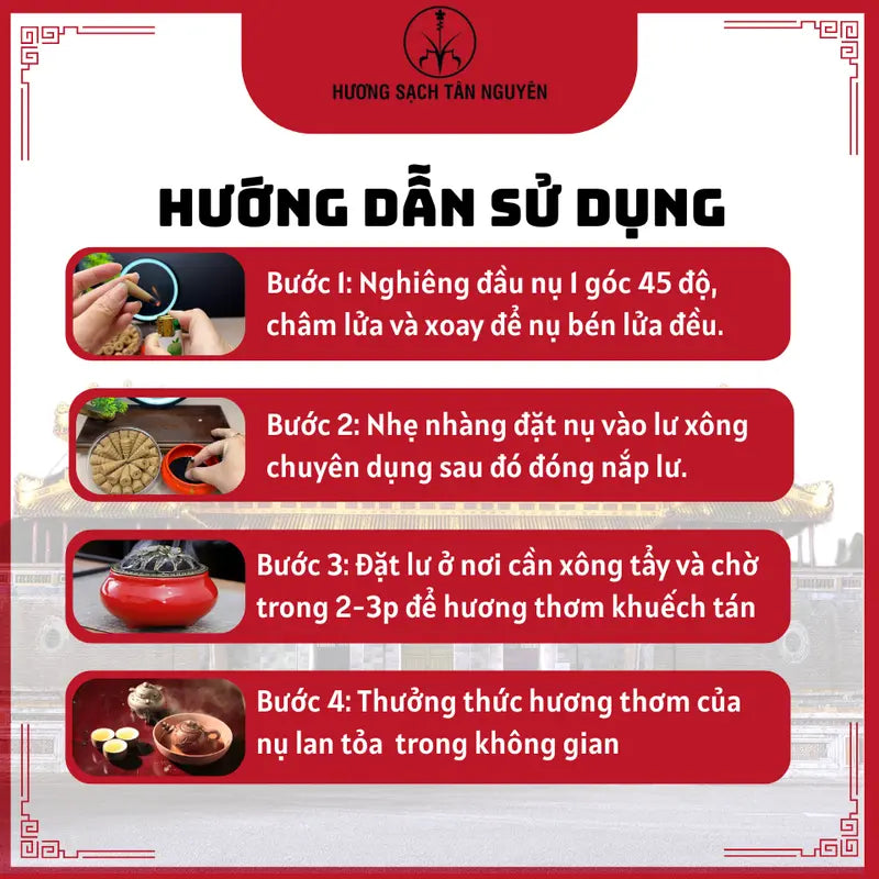 Sản phẩm được làm từ 100% thành phần thiên nhiên gồm trầm hương, vỏ quế, đàn hương và bột keo bời lời, nên hoàn toàn an toàn, không gây hại cho sức khỏe – phù hợp cho cả người lớn và trẻ em.